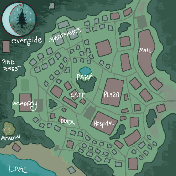Eventide, for centuries, has been at odds with the vampires and werewolves. While they fought amongst each other right outside of town or hiding within it, they also harmed the humans living there. Vampires fed on the blood of humans in the night, and werewolves mauled anyone near during the full moon.Generations later, the feud and living in constant fear is getting tiring. Vampires and werewolves have agreed to leave the bloodshed and disputes behind, and the younger ones want nothing more than to live normal lives.A couple months ago, Eventide opened up to them with welcome arms as long as no human within town gets hurt and they leave their fighting in the past. Because of how recent it was, the tension is still high... but they're trying their best to adapt.Here is a very general map to help visualize the layout of the town. more locations and channels will open up in the server as needed.